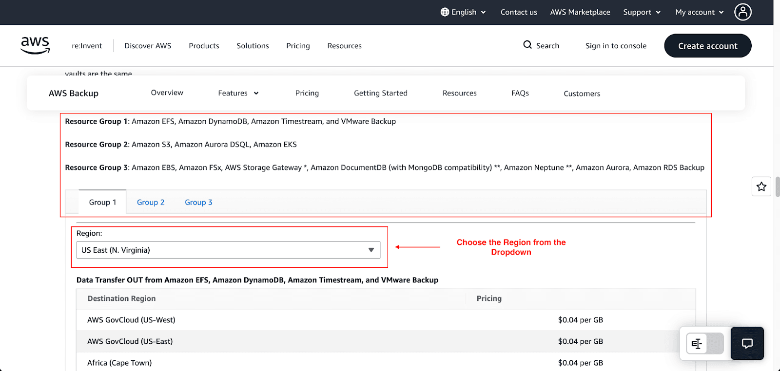 To ensure disaster recovery, it is feasible to duplicate certain backups to other AWS Regions. However, you will incur a data transfer charge. Charges are assigned when data exists in a specific region. An example would be transferring data from US East (N. Virginia) to another region, such as US West (California), which would cost an estimated $0.04/GB. Data transfers within a single region are entirely free.