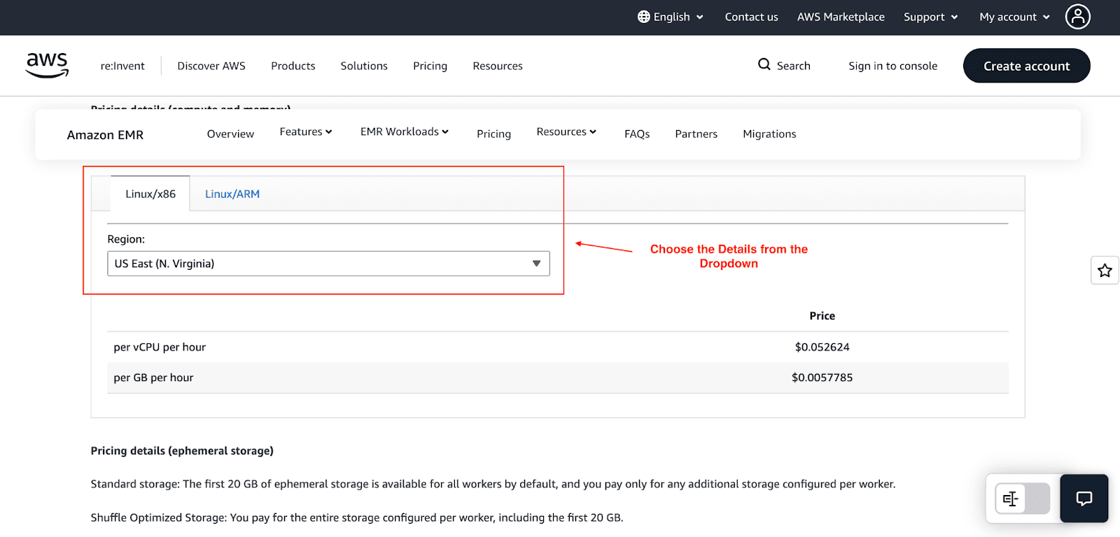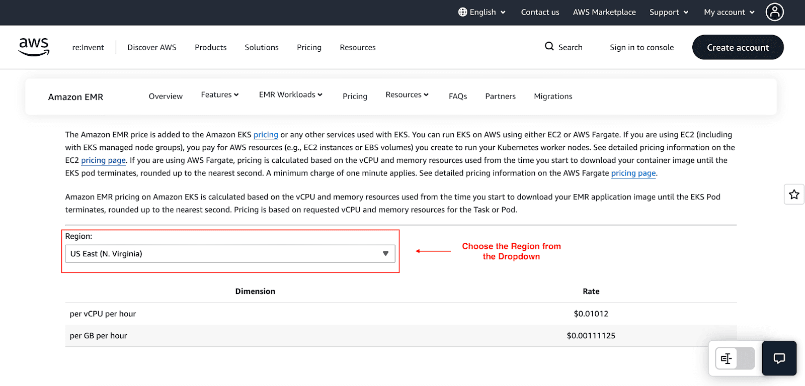 With Amazon EMR on Amazon Elastic Kubernetes Service, you pay for memory and vCPUs processing by your tasks or pods. The billing captures the period from the commencement of image downloads and ceases when engagement of the task or pod is done. There's a minimum of a 60-second billing window. For example, in the US East (N.Virginia) Region is priced at $0.01012 per vCPU per hour and $0.00111125 per GB per hour of memory.