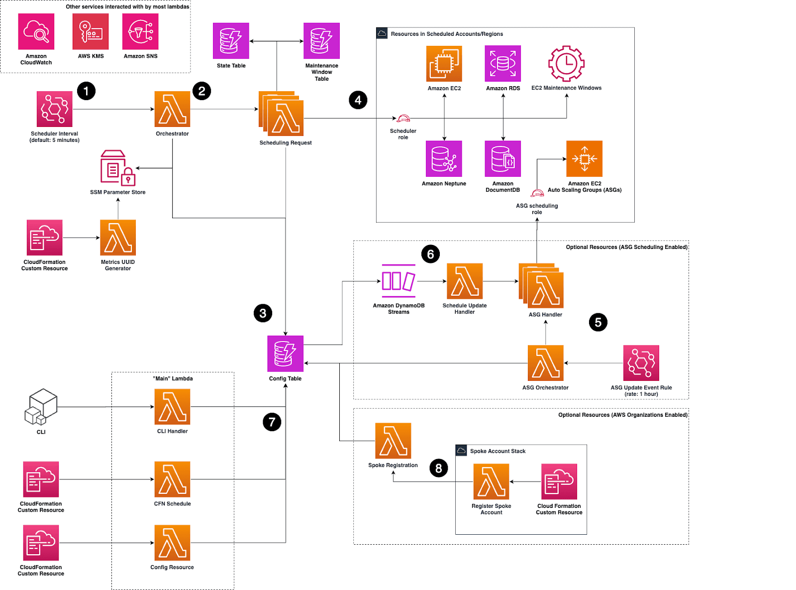 Multi-Account Support: Multi-account management is possible by deploying the scheduler in a primary account and paired with IAM roles; managing resources in the entire AWS Organization is effortless.