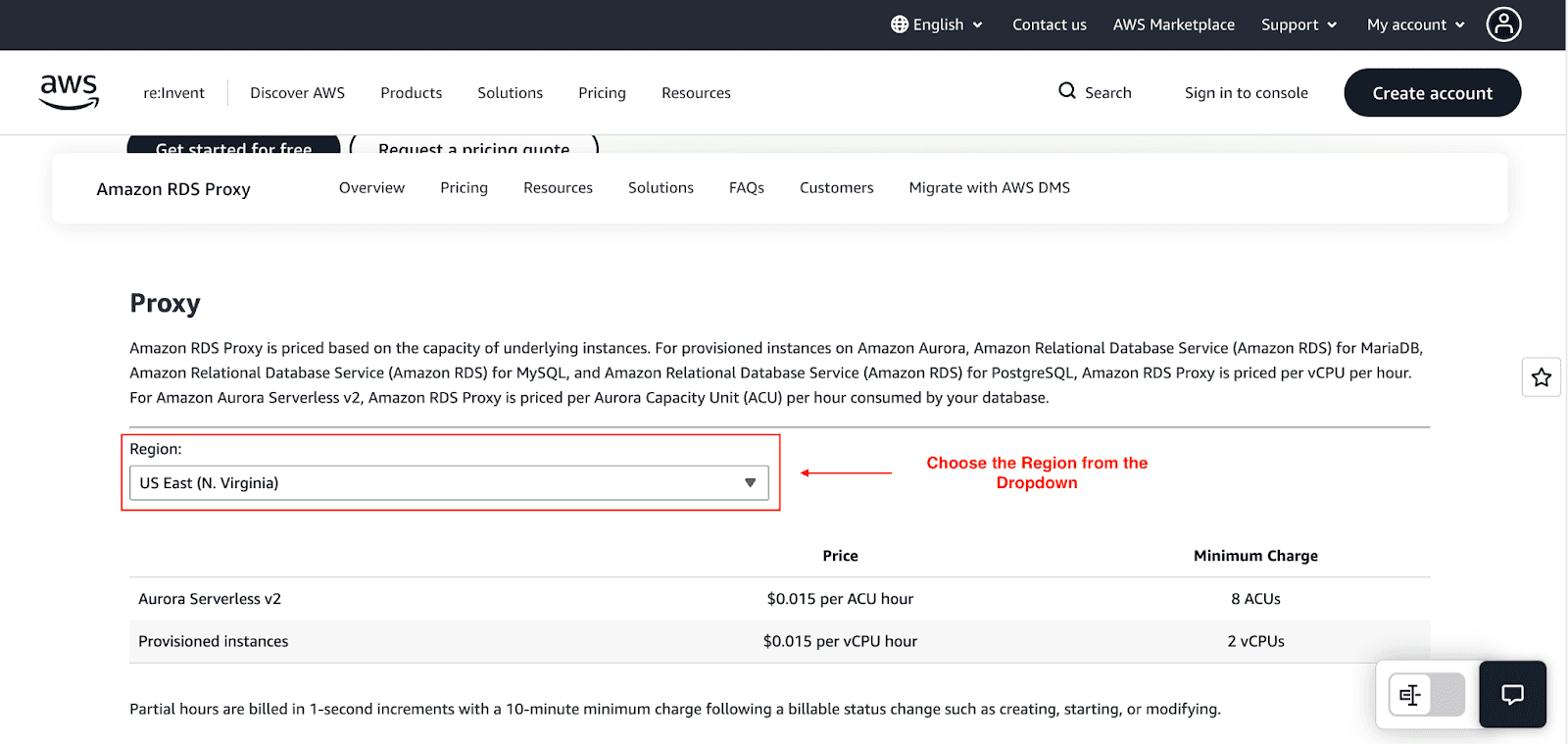 For provisioned RDS instances (Aurora, RDS for MySQL, RDS for PostgreSQL, RDS for MariaDB), RDS Proxy charges are on a per vCPU, per hour basis, depending on the type of the underlying database instance, with a minimum charge of $0.015 for each vCPU hour with 2 vCPUs.