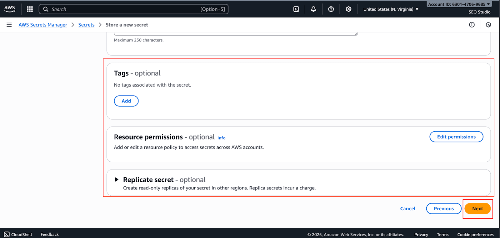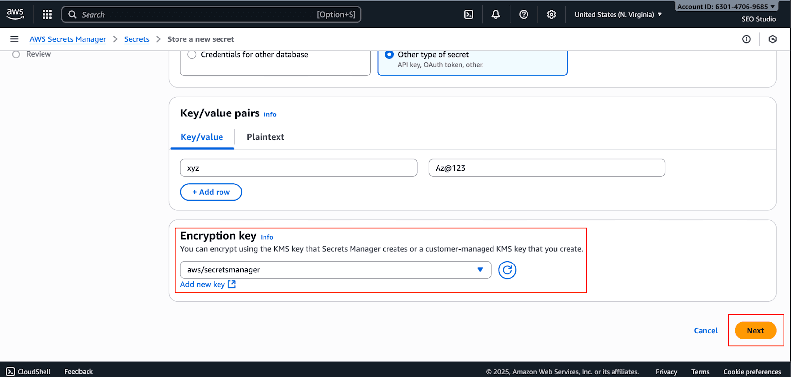 Choose AWS KMS encryption key. You can use the default AWS-managed key or a customer-managed key for more control, and click on Next.