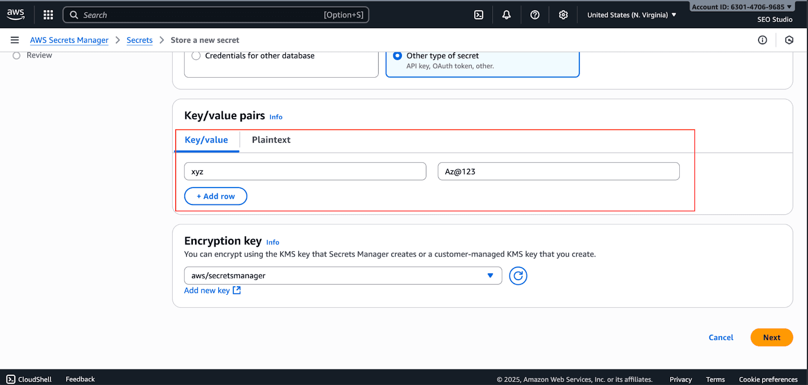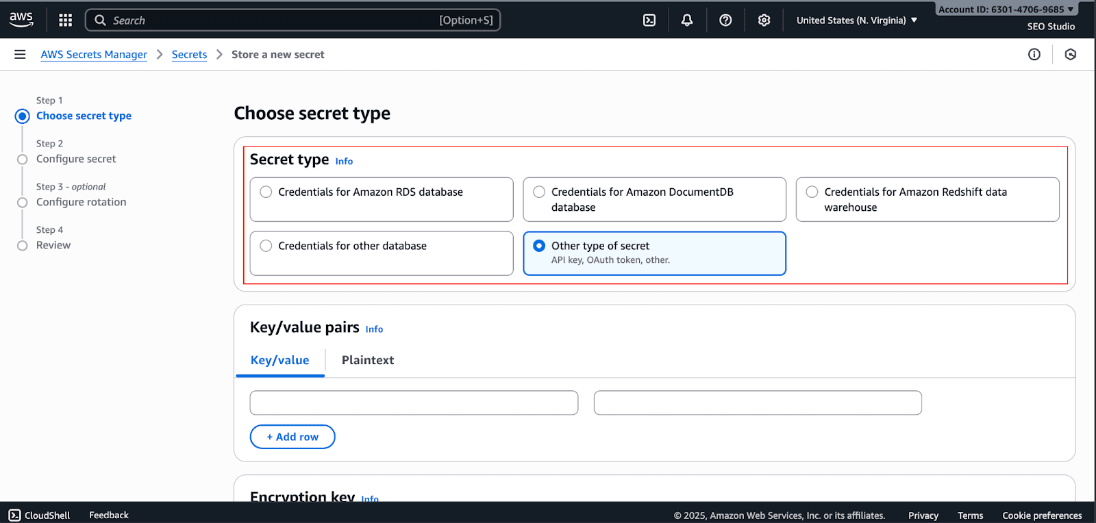 Choose the secret type (e.g., Credentials for RDS database or Other type of secret). For this example, select Other type of secret.