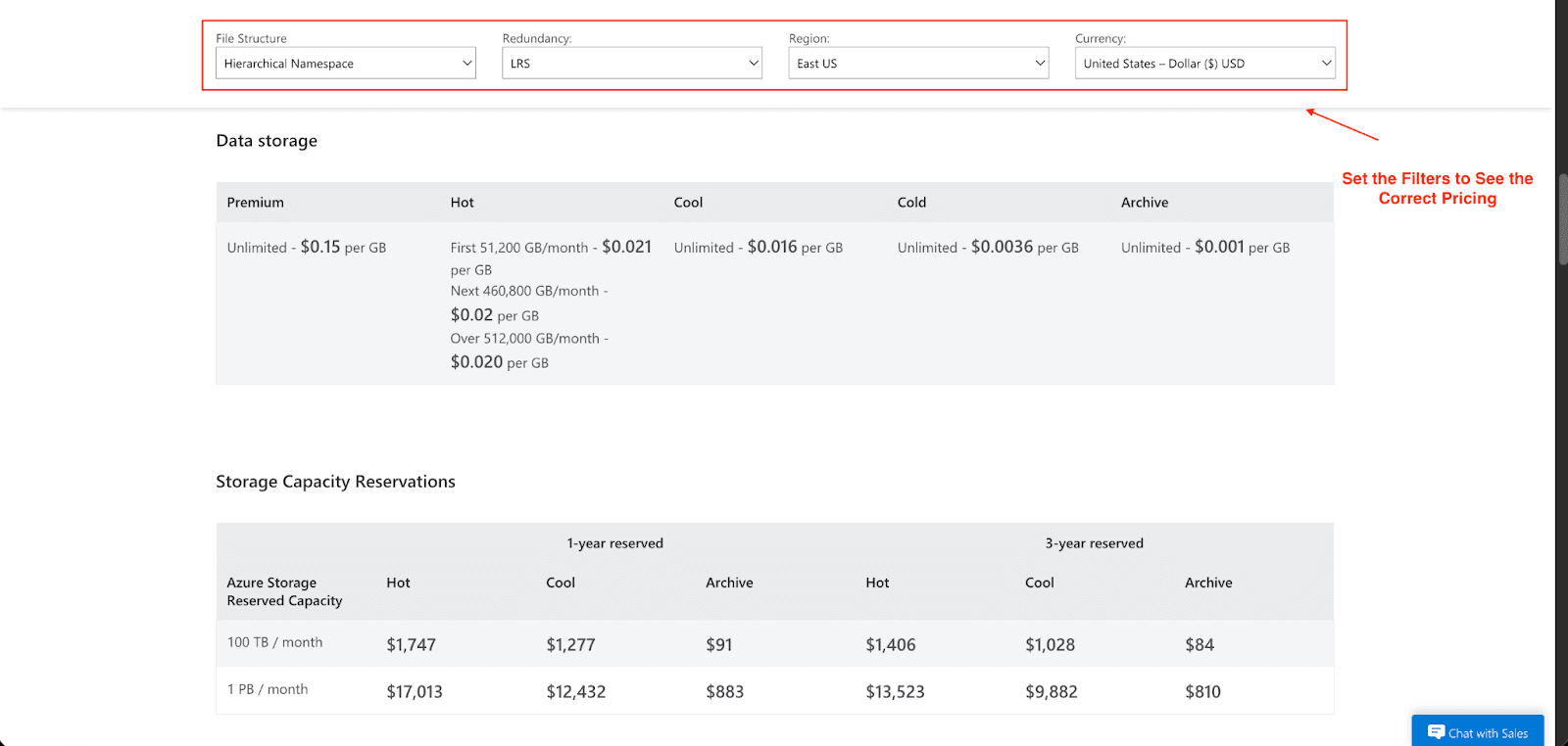 Storage Costs: You pay monthly for the amount of data you store as well as the storage tier, which could be Premium, Hot, Cool, Cold, or Archive. There are also multiple redundancy options available to choose from, which include: LRS, GRS, and ZRS. An example of this is that while the Premium tier charges $0.15 for every GB of data, the hot tier charges $0.021 for the first 50 TB per month. The costs can be reduced to a great extent by buying a reserved capacity, which could be for one or three years at a time. Therefore, for 100 TB reserved for 3 years, at the Hot tier, the price would be $1,406, whereas the price for one year is $1,747.