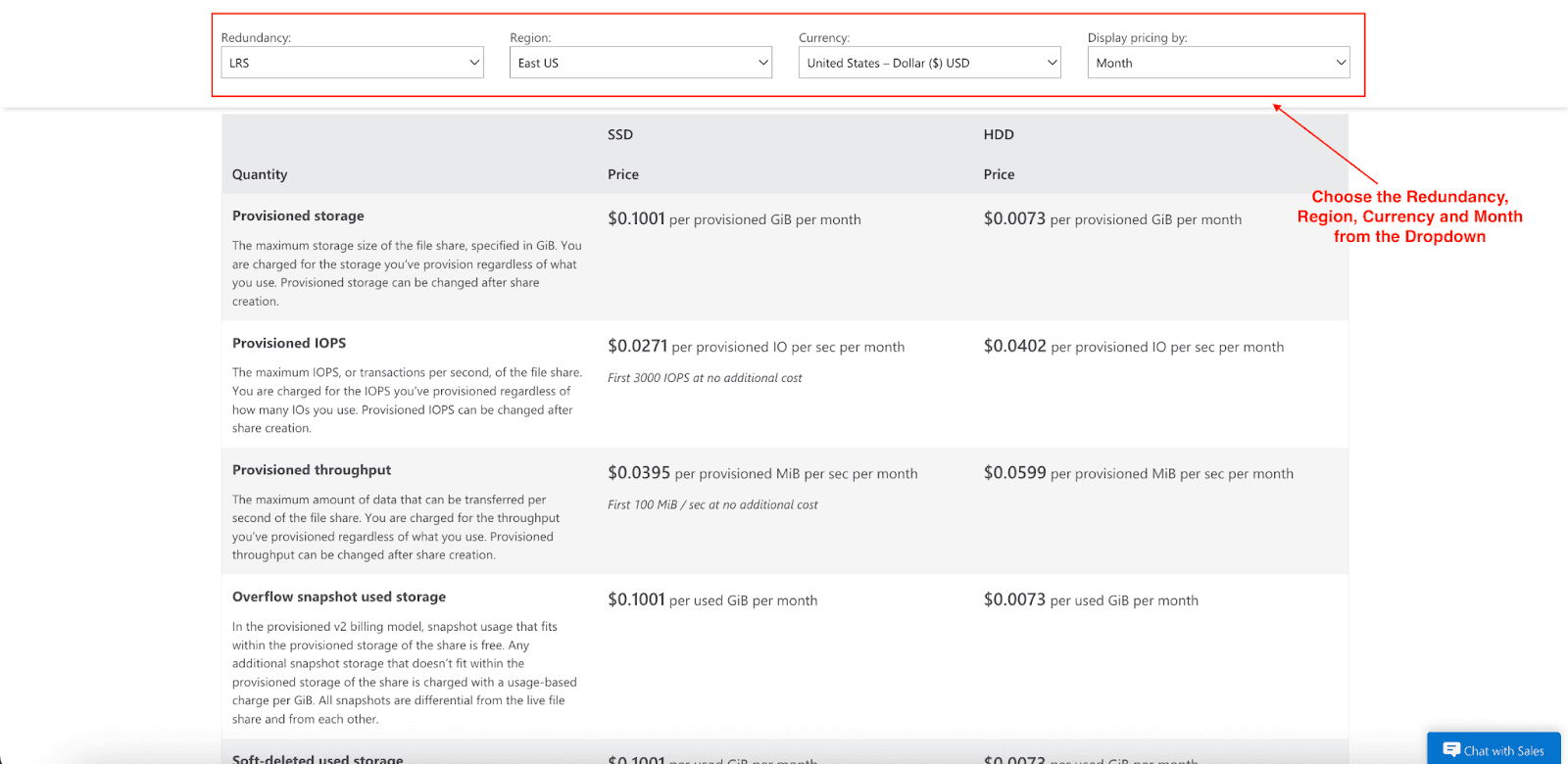 Note: Pricing varies by region and redundancy option selected