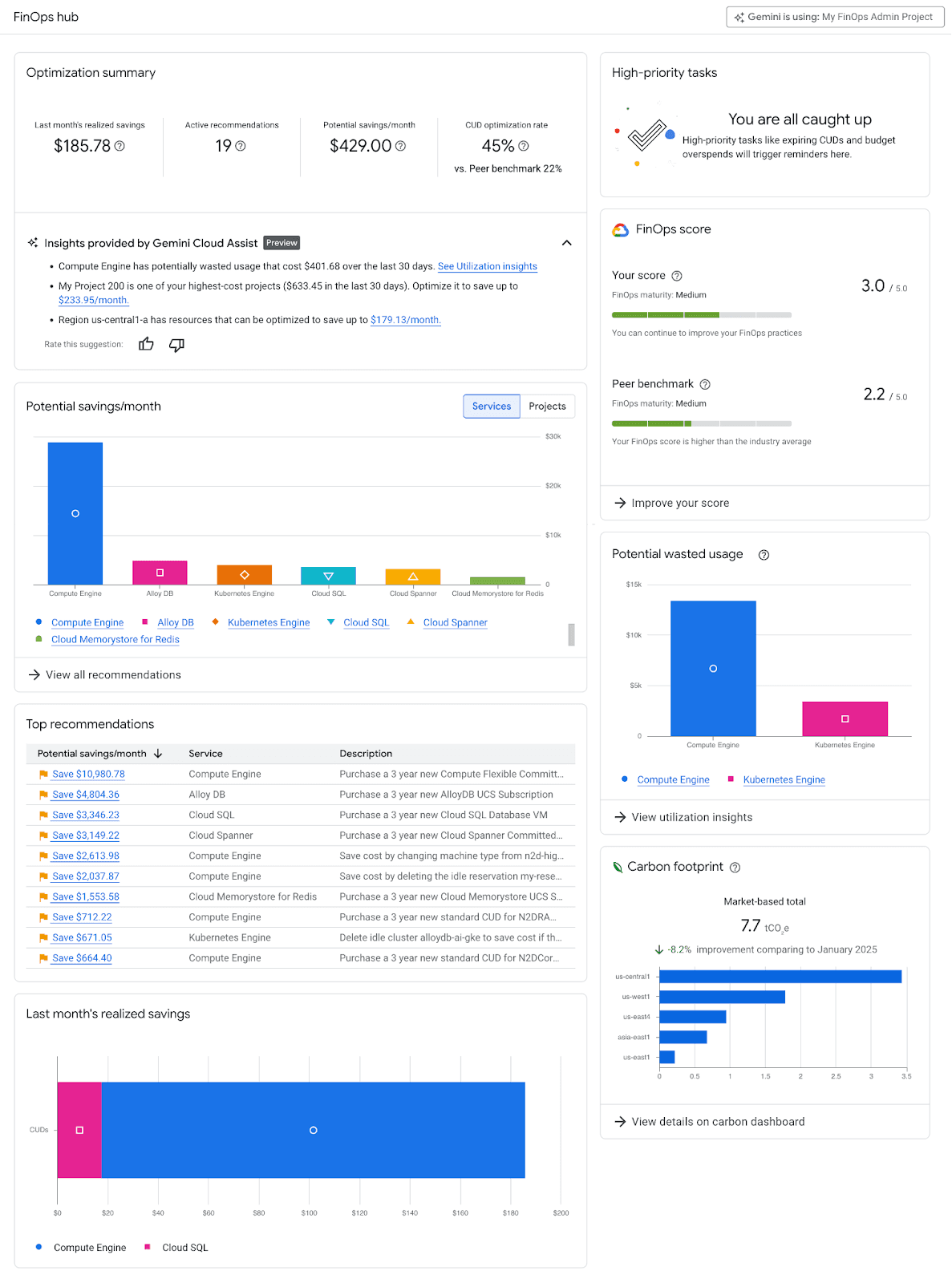 What It Does: Identifies recommendations like dead resources (zombie VMs), and opportunities for downsizing (rightsizing) by recommending the downsizing of overscaled instances, as well as identifying your gaps of CUD coverage.